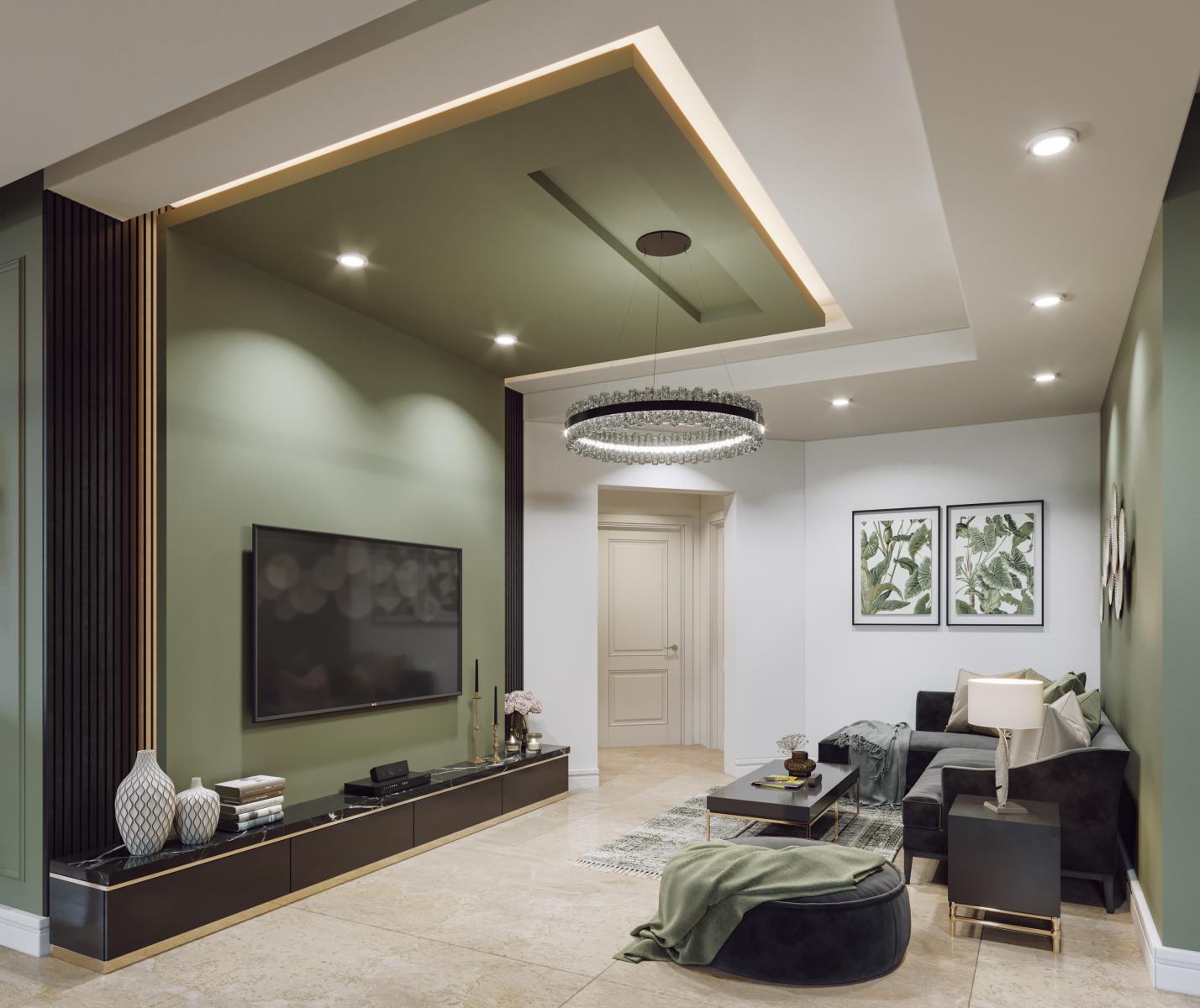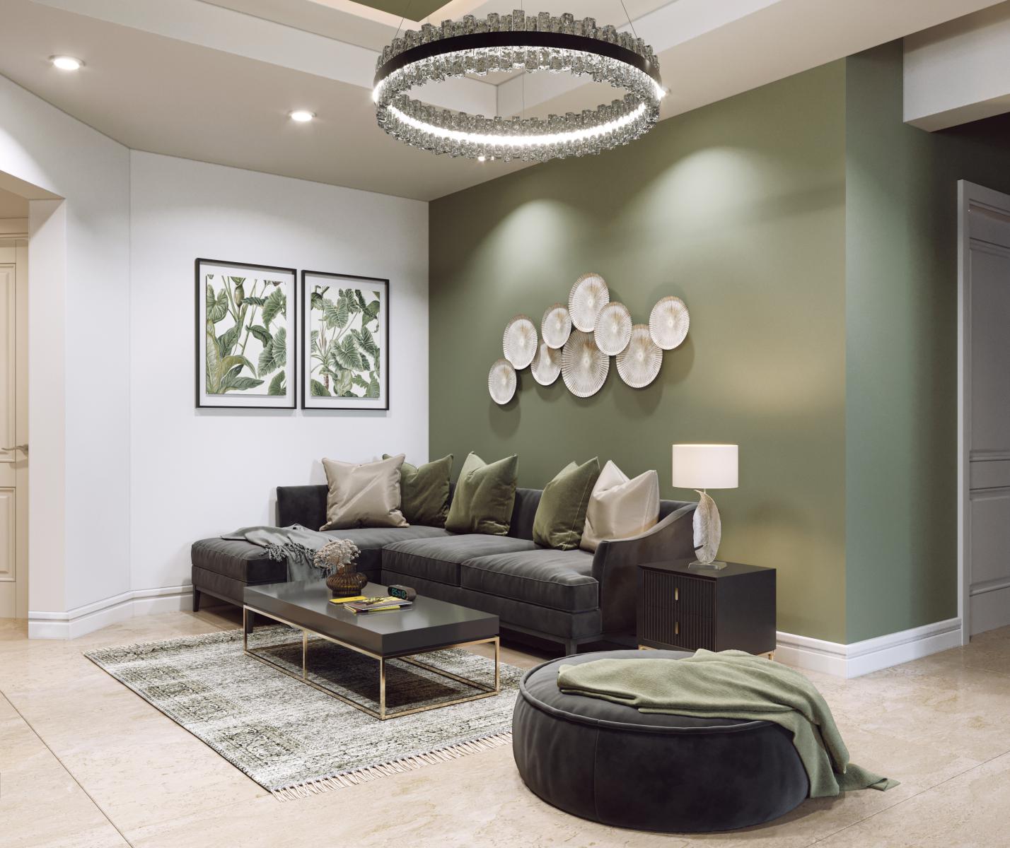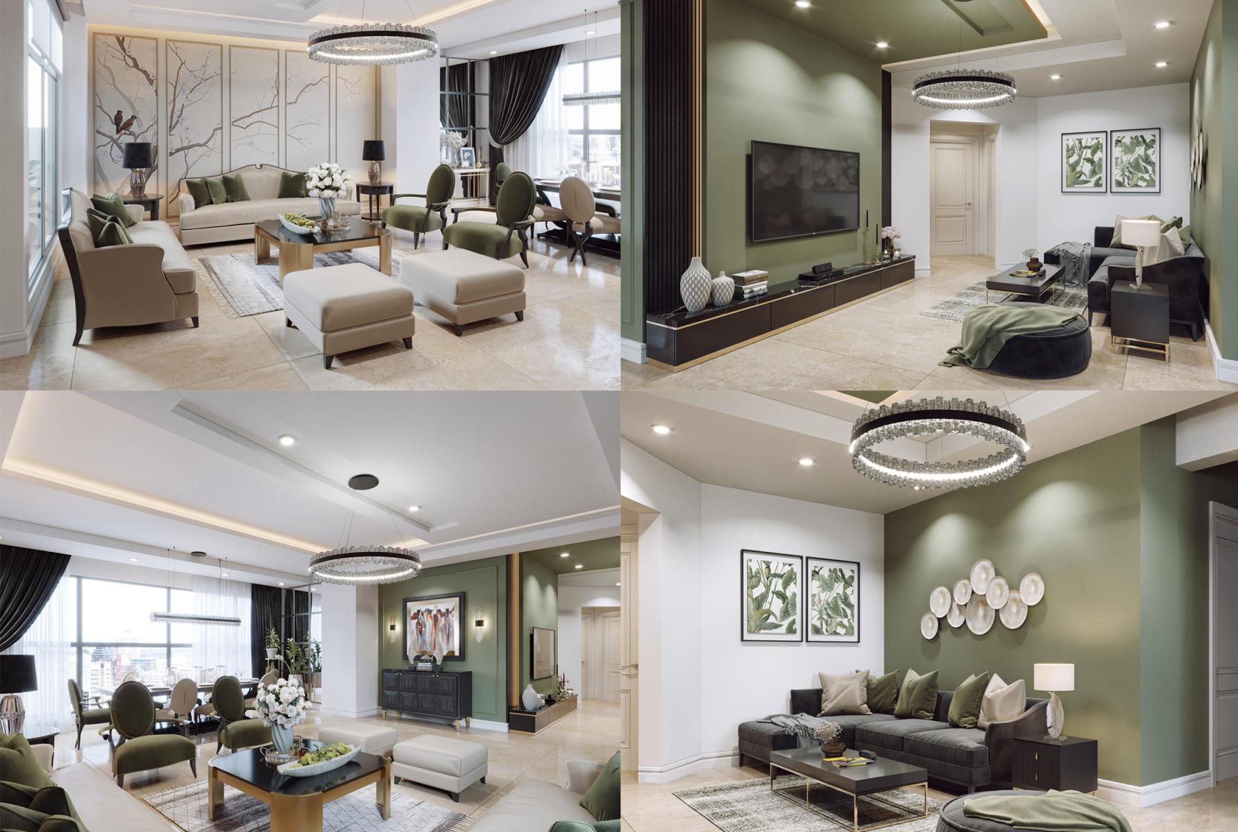 صحنه آماده رندر دکوراسیون داخلی منزل با تم رنگی سبز و کرم